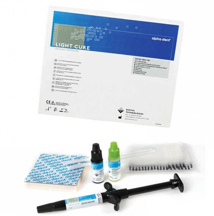 Kit de dose unitaire d’adhésif pour support photopolymérisable Alpha-Dent. Contient : 40 à 0,35 g de dose unitaire (14 g au total), 7 ml de résine de liaison pour brackets LC, 1 à 4 g de seringue de gel de gravure, un tampon distributeur. Ce kit est un système adhésif pour brackets orthodontiques en pâte-adhésive formulé pour adhérer aux brackets en métal, en céramique et en plastique. La combinaison unique de charges utilisée dans la pâte produit une liaison idéale et une consistance collante lisse minimisant la flottation des brackets et éliminant les contraintes de temps de travail.